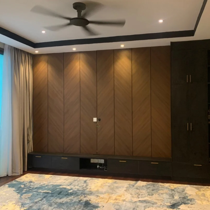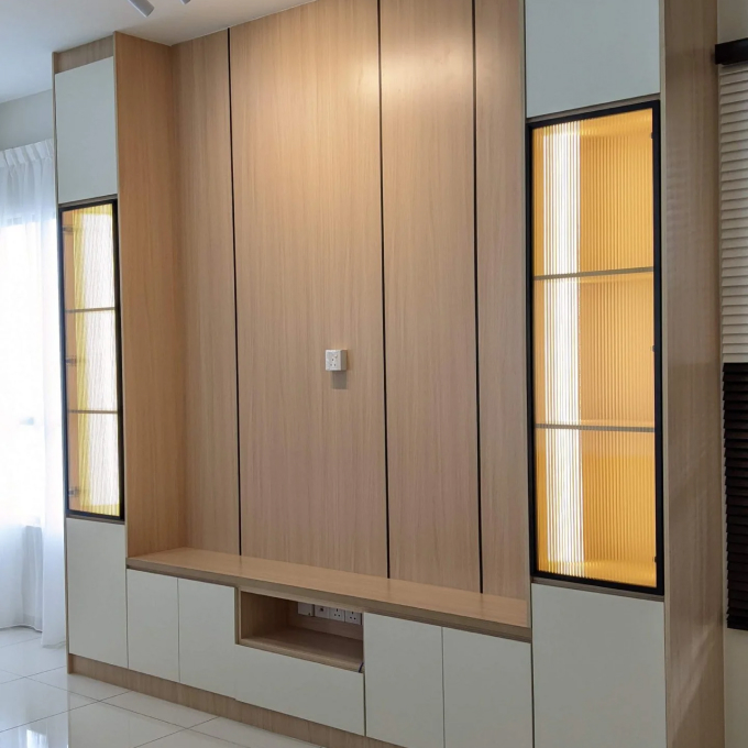 Ya, ramai pelanggan memilih set kabinet TV built-in dengan rak display & kabinet ruang tamu custom supaya lebih praktikal & bergaya.