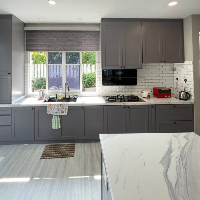 Warna putih matte, beige, grey minimalis antara pilihan kegemaran untuk kabinet MDF dapur moden.
