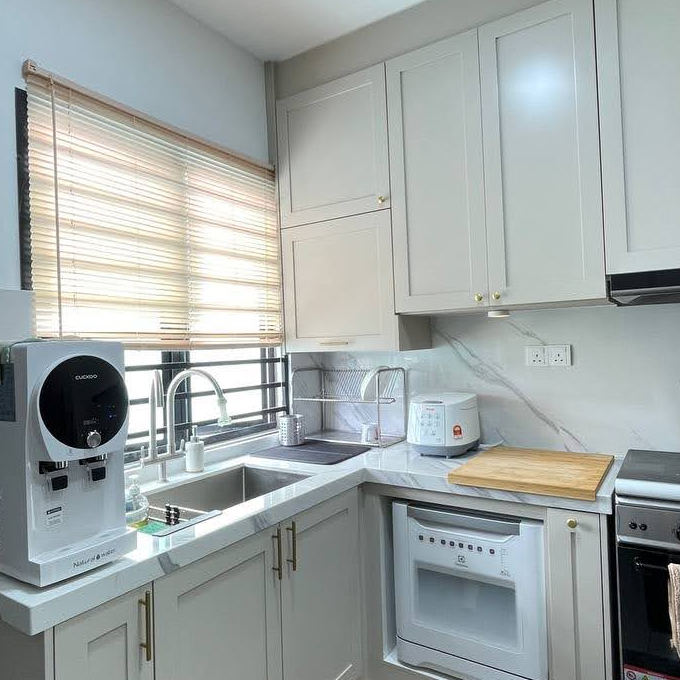 Ia sesuai untuk rumah moden atau ruang dapur kecil yang perlukan reka bentuk minimalis. Dari segi penjagaan kabinet MDF, elakkan air berlebihan & gunakan pembersih lembut untuk ketahanan lebih lama.