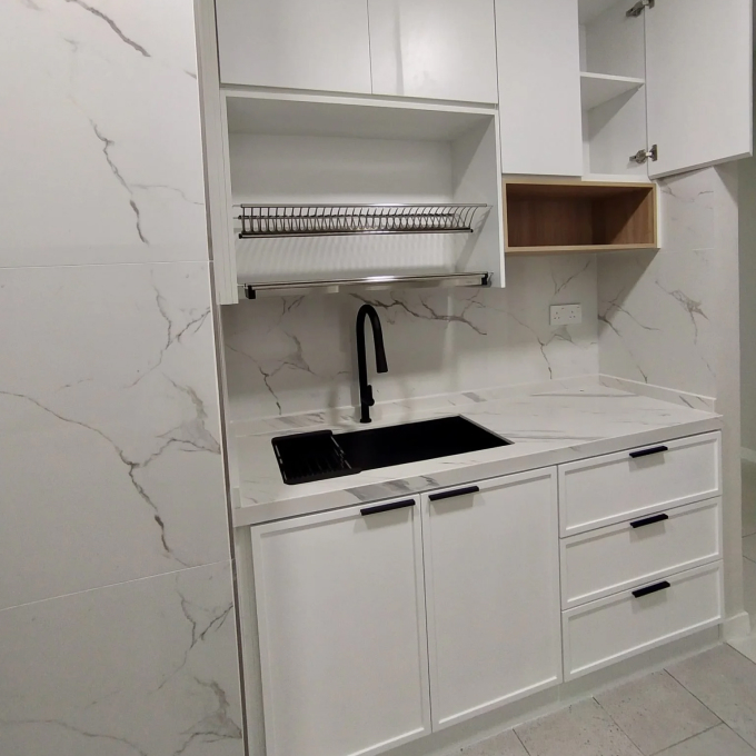 Ia sangat sesuai untuk ruang dapur kecil atau besar, memberi sentuhan moden dengan permukaan licin dan kemasan kemas. Dari segi penjagaan, cukup dilap dengan kain lembap tanpa perlu rawatan rumit. Dengan kombinasi praktikal, estetik dan ketahanan, kabinet melamine terus menjadi pilihan utama dalam senarai material kabinet dapur moden.